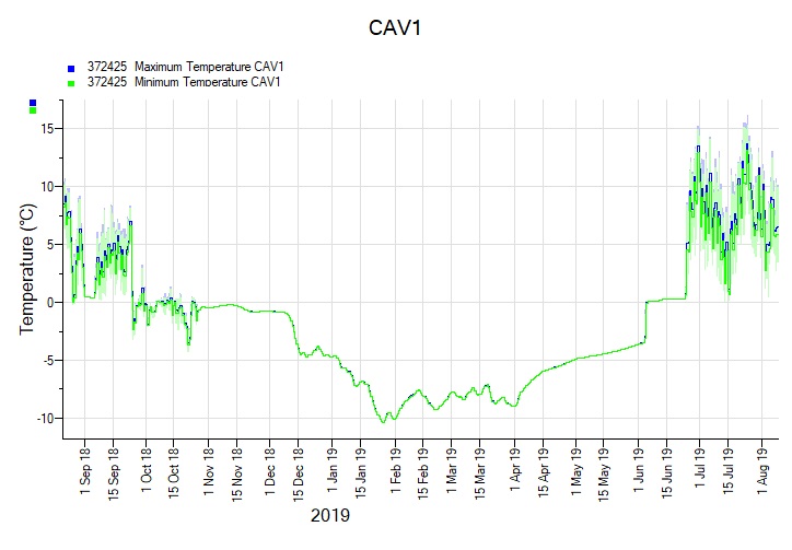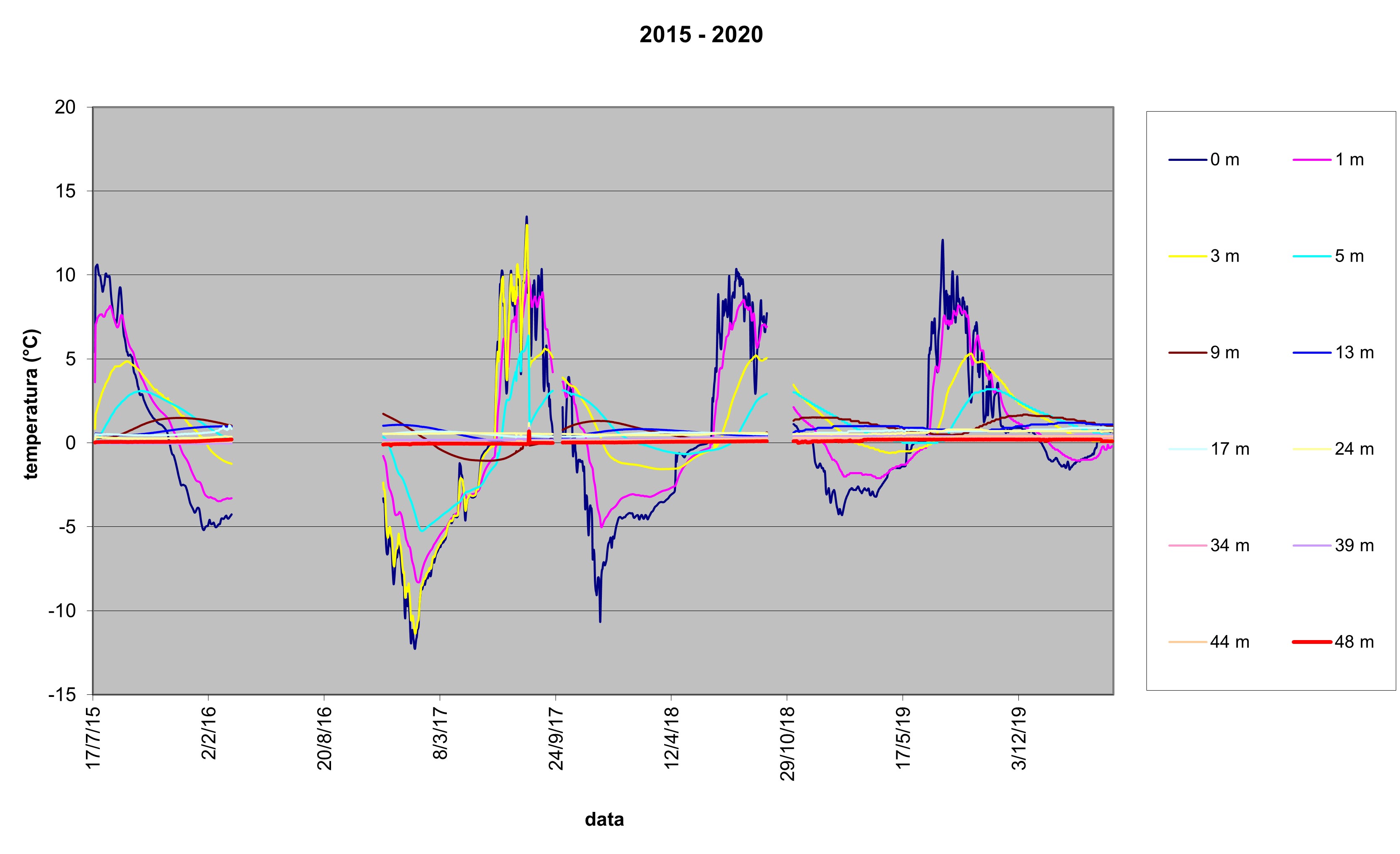 I monitoraggi finora eseguiti mostrano una presenza discontinua del permafrost nell’area del Cavaion, con sua maggior diffusione oltre i 2900 m metri di quota, specie sulle falde detritiche esposte a nord e all’interno dei rock glaciers presenti in zona. Il sito di perforazione è probabilmente al margine inferiore dell’areale con permafrost, come mostrano le temperature attorno a 0°C o appena superiori, a 40-50 m di profondità. A queste profondità non sembrano esserci particolari tendenze delle temperature, mentre negli ultimi anni si può osservare una tendenza al riscaldamento per gli strati rocciosi più vicini alla superficie (Fig. 5).