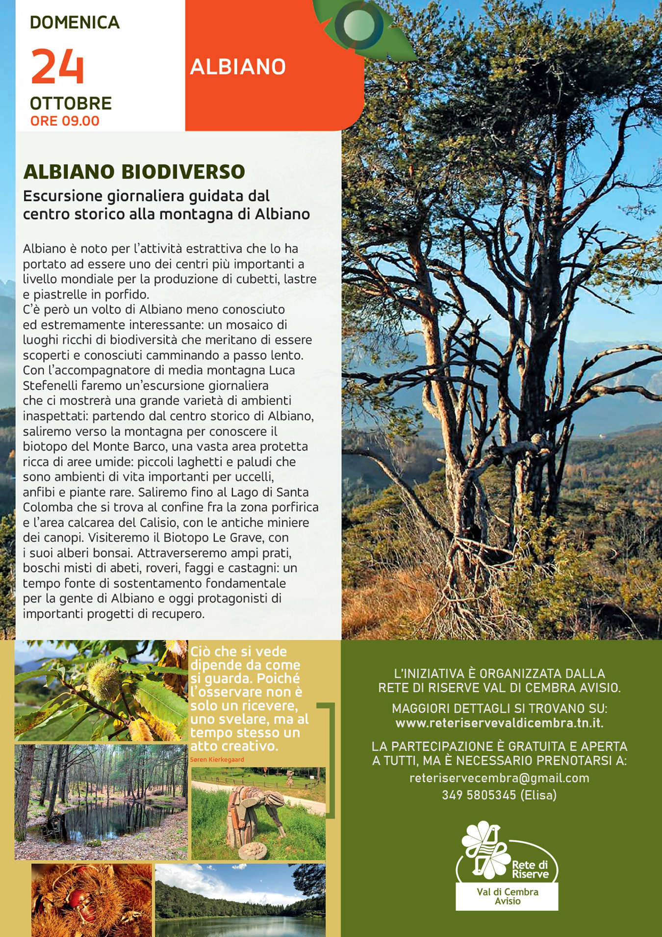 Mit dem Mittelgebirgsführer Luca Stefenelli machen wir einen Tagesausflug, der uns eine große Vielfalt an unerwarteten Umgebungen zeigen wird: vom historischen Zentrum von Albiano aus steigen wir in Richtung Berg und dann zum Santa Colomba See auf, der an der Grenze zwischen der Porphyrzone und dem kalkhaltigen Gebiet von Calisio mit seinen alten Kanopenminen liegt. Wir besuchen das Biotop Le Grave mit seinen Bonsai-Bäumen. Wir durchqueren weite Wiesen, Mischwälder mit Tannen, Eichen, Buchen und Kastanien: einst eine wichtige Nahrungsquelle für die Bewohner von Albiano und heute die Protagonisten wichtiger Wiederherstellungsprojekte.