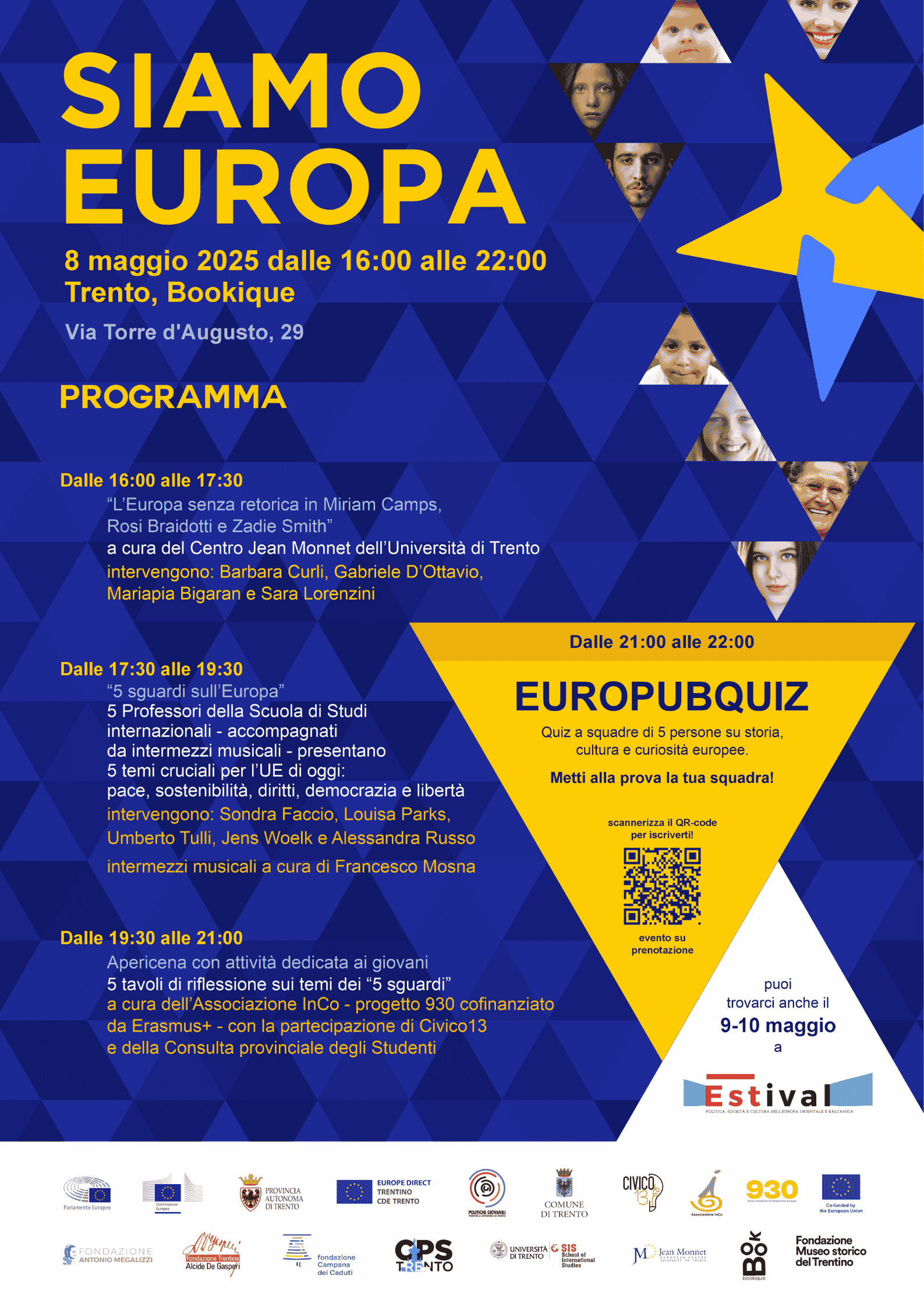 Diese Veranstaltung wird wie jedes Jahr von verschiedenen Einrichtungen der Provinz organisiert, die sich für die Förderung der europäischen Werte einsetzen: Die Autonome Provinz Trient mit Umse Europa-Europe Direct Trentino und CDE Trient, das Amt für Jugendpolitik, die Universität Trient mit der Fakultät für Internationale Studien und dem Jean-Monnet-Zentrum, die Stadtverwaltung Trient mit dem Jugendreferat - Civic 13, die Stiftung Antonio Megalizzi, die Stiftung Trentino Alcide De Gasperi, die Stiftung Historisches Museum Trentino, der Studentenrat der Provinz, die Stiftung Campana dei caduti von Rovereto.
